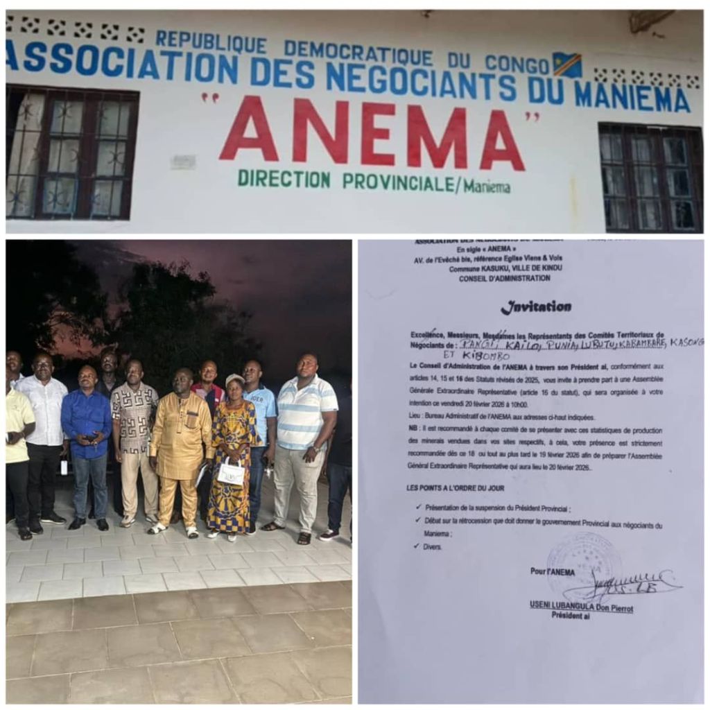L’étau se resserre pour David Kikuni Israel. L’Association des Négociants du Maniema (ANEMA) a officiellement convoqué une Assemblée Générale Extraordinaire pour ce vendredi 20 février 2026 à Kindu. Sous la direction du président intérimaire Useni Lubangula Dompierrot, cette réunion au sommet semble marquer la fin de règne pour le président suspendu, dont le départ définitif est désormais au centre de toutes les attentes de la corporation.